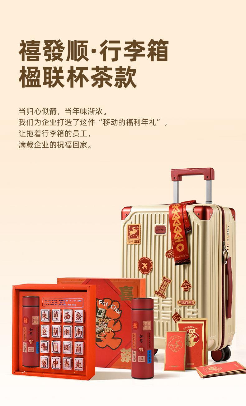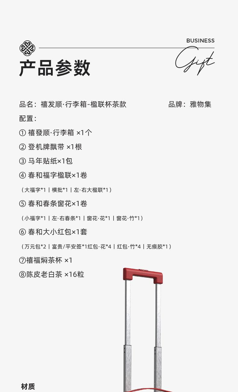 配置 · ① 禧發(fā)順·行李箱 ×1個 ② 登機(jī)牌飄帶 ×1根 ③ 馬年貼紙×1包 ④ 春和福字楹聯(lián)×1卷 (大福字*1丨橫批*1丨左·右大楹聯(lián)*1) ⑤ 春和春條窗花×1卷 (小福字*1丨左·右春條*1丨窗花·花*1丨窗花·竹*1) ⑥ 春和大小紅包×1套 (萬元包*2丨富貴/平安簽*1紅包·花*4丨紅包·竹*4丨無痕膠*1) ⑦禧福燜茶杯 ×1 ⑧陳皮老白茶 ×16粒