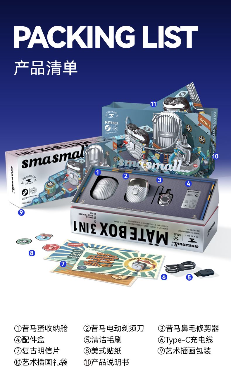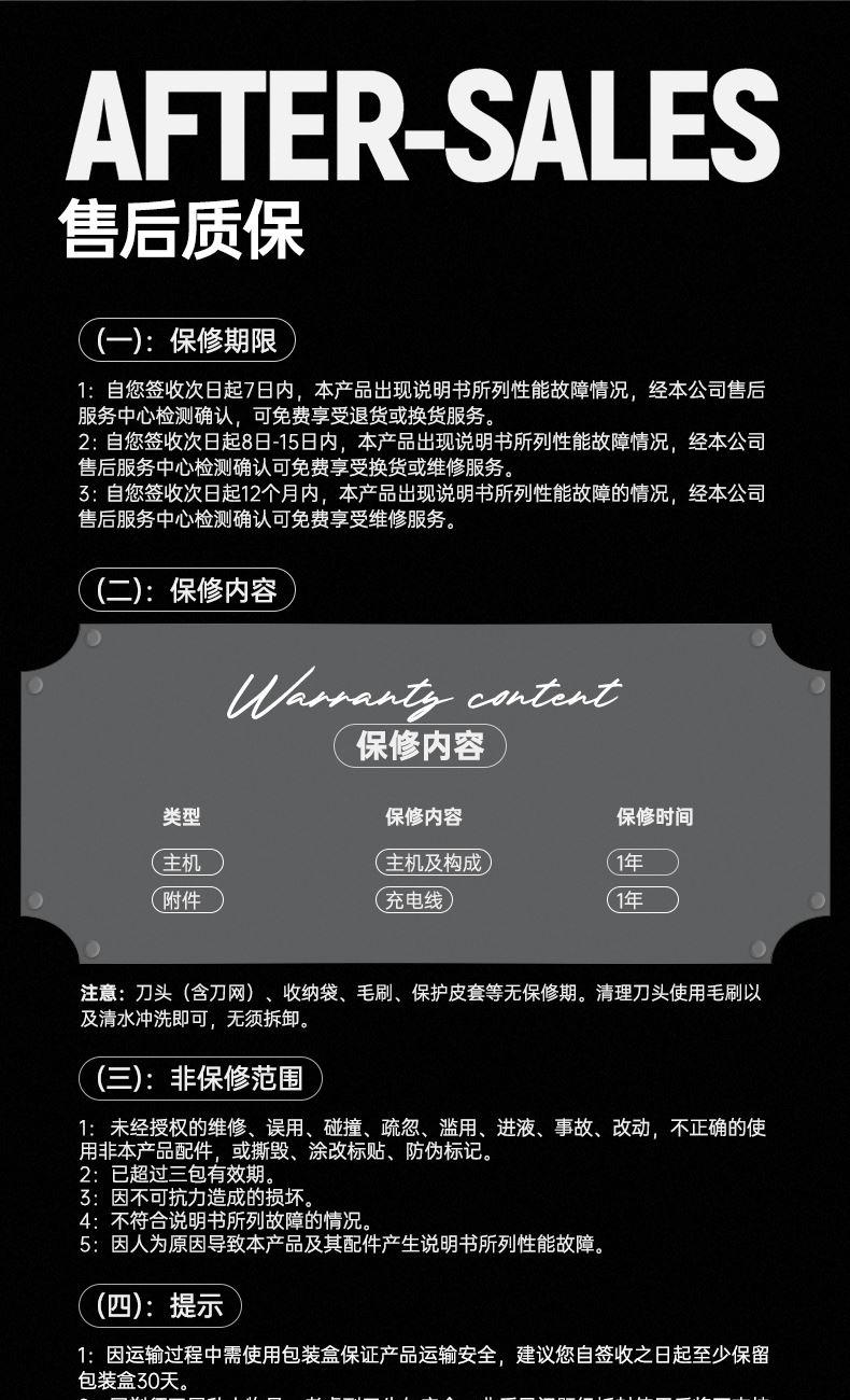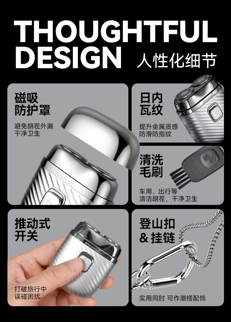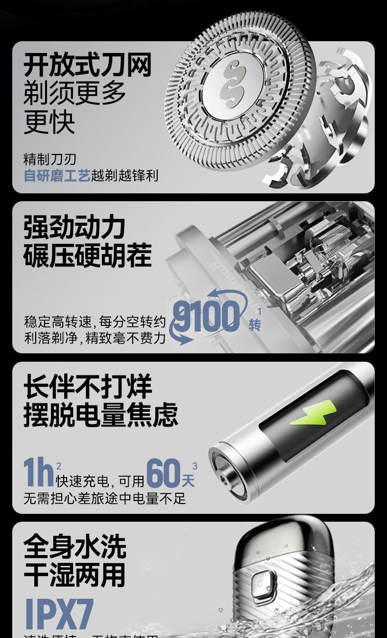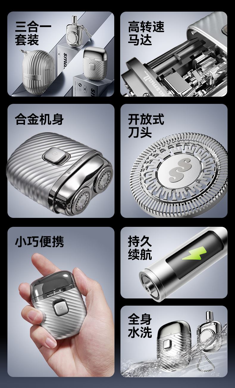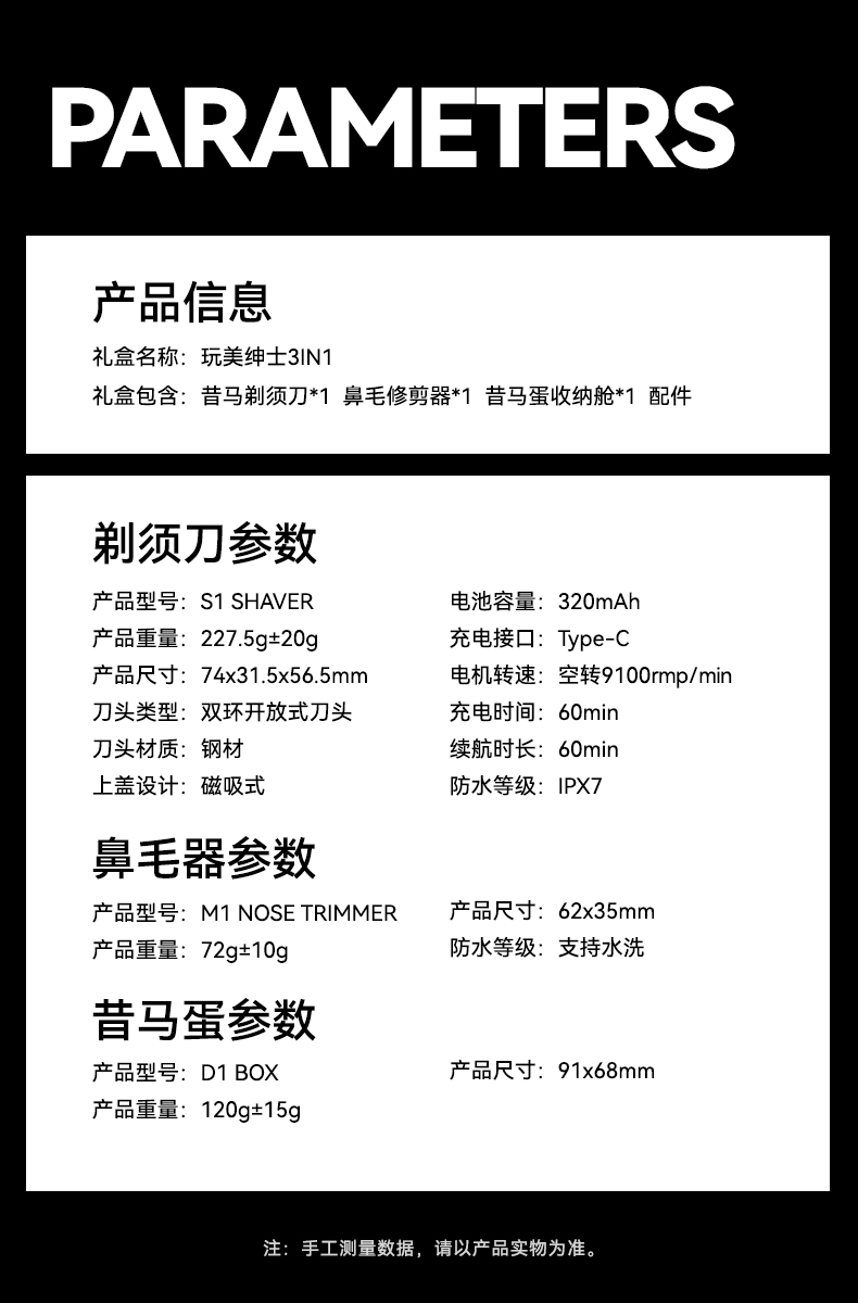 剃須刀: 電池:320毫安 電池材質(zhì):高容量鈷酸鋰 充電接口:Tpye-C 續(xù)航時間:60分鐘 充電時長:1小時 防水等級:ipx7級防水 刀片材質(zhì):進口鋼材 內(nèi)開放式刀頭 鼻毛器: 材質(zhì):合金 防水等級:ipx7級防水 產(chǎn)品重量單/整箱: 剃須刀:405g 鼻毛器:72g 昔馬蛋:116g 整套含包裝:1159g 整箱:11700g