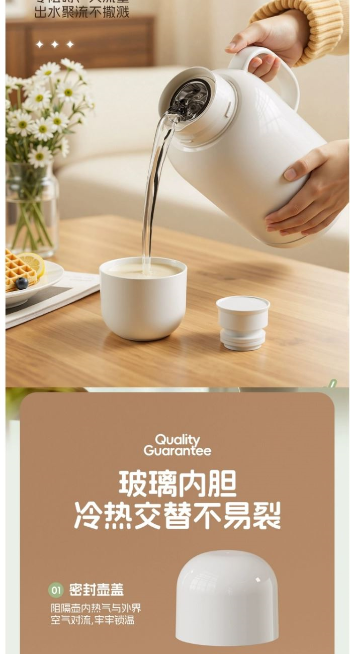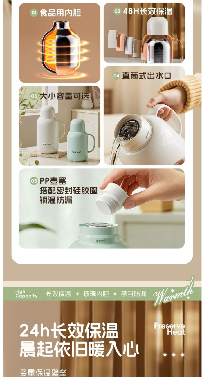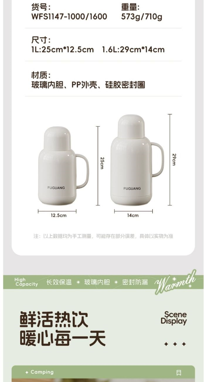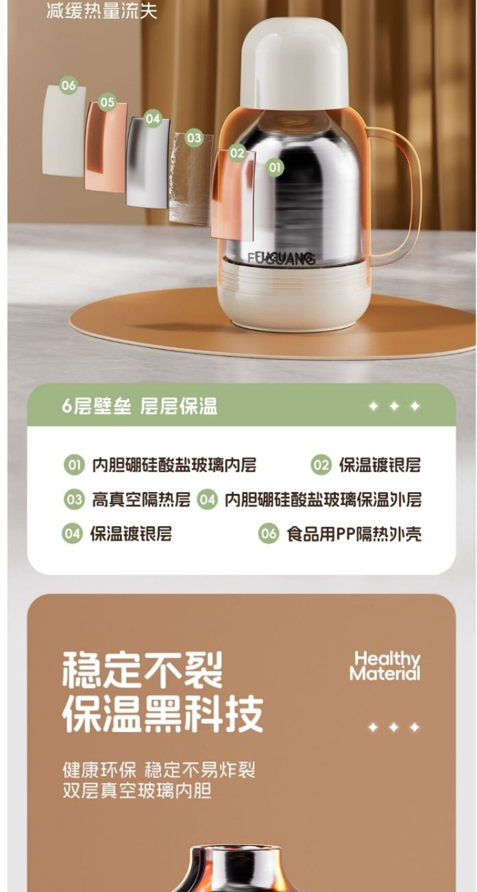 顏色:綠色 白色 紅色 尺寸:12.5*25 材質(zhì):食品級(jí)PP壺身外殼,高硼硅紅膽玻璃內(nèi)膽,食品接觸用硅膠圈。 真空夾層,增強(qiáng)保溫效果。 一體式把手,人體工學(xué)設(shè)計(jì),寬厚省力,防滑底墊放置更穩(wěn)不易傾斜。 包裝:?jiǎn)瓮吆?