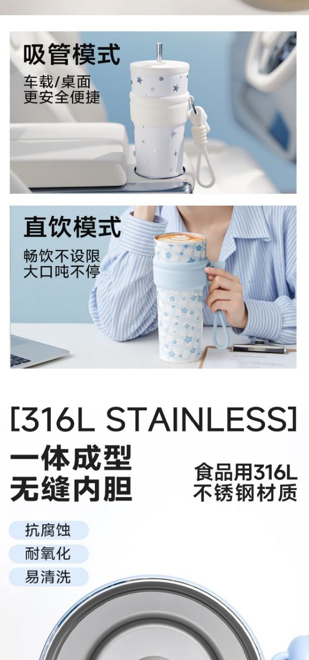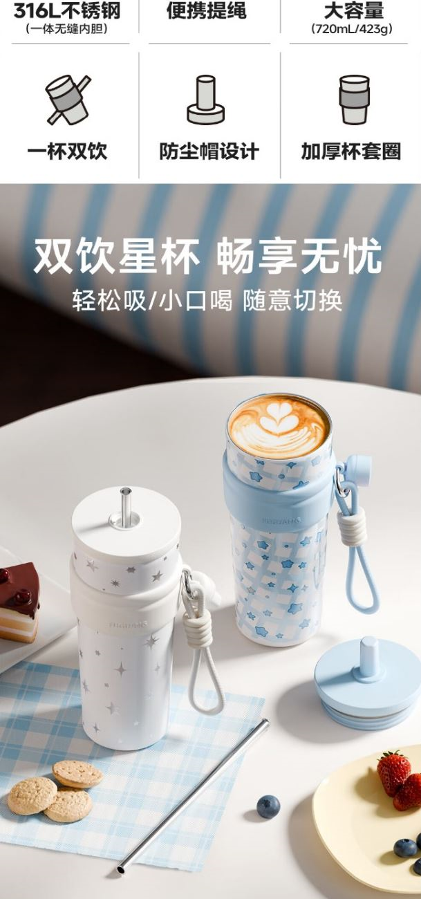 顏色:白色 藍色 重量:423g 材質(zhì):316L不銹鋼內(nèi)膽,食品級PP塑件。 直飲小口,優(yōu)雅飲水,硅膠底墊,防滑靜音。 可拆卸專屬杯帽架掛上去不怕丟。復(fù)古格調(diào),星光點點。 輕松小口喝,雙飲暢飲無憂。 包裝:單瓦盒