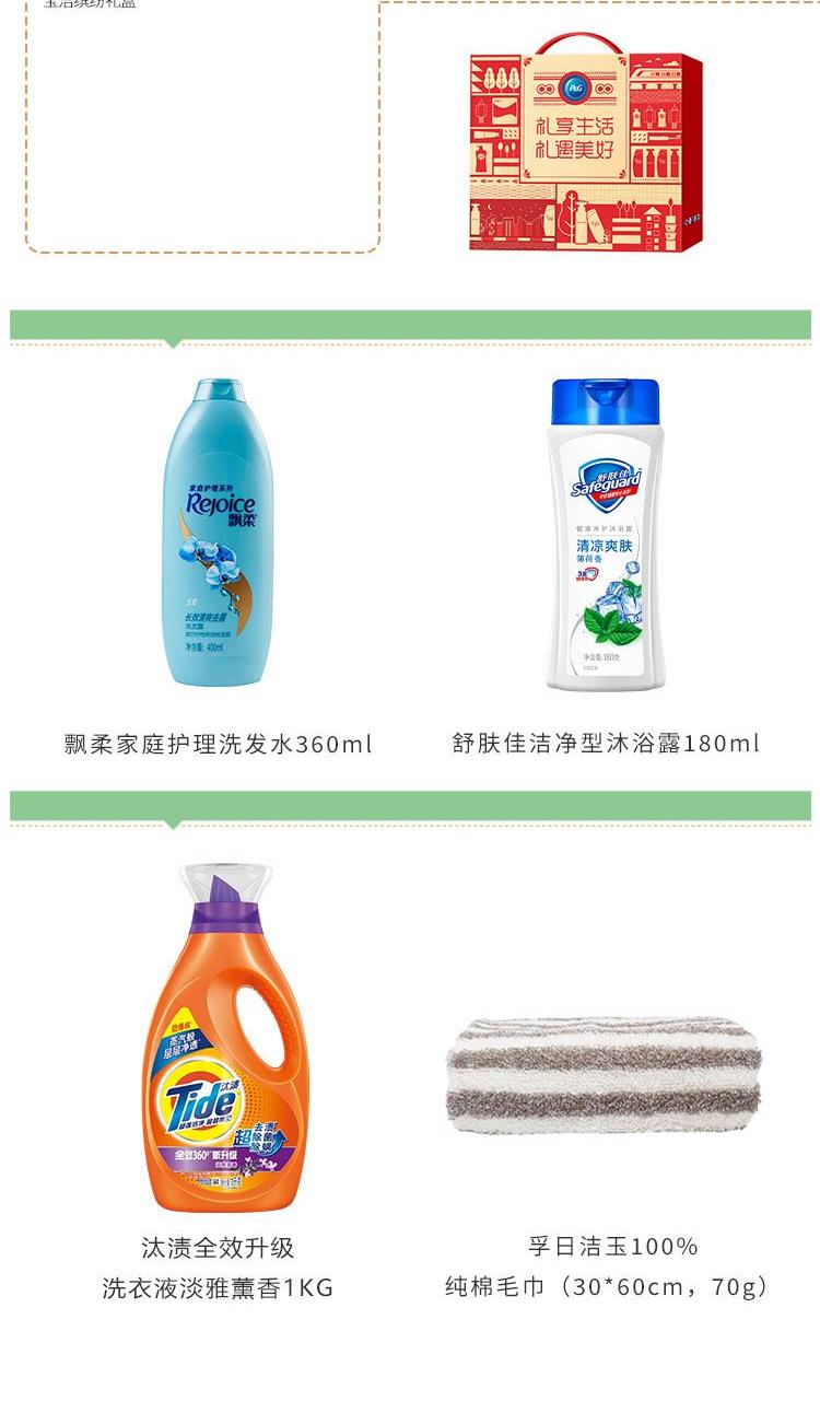 飄柔家庭護(hù)理洗發(fā)水360ml 舒膚佳潔凈型沐浴露180ml 汰漬全效升級洗衣液淡雅薰香1KG 孚日潔玉純棉毛巾(30*60cm,70g) 寶潔繽紛禮盒