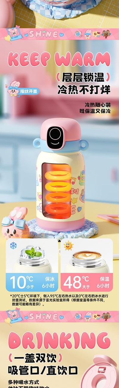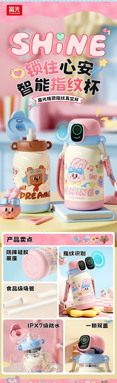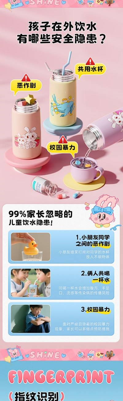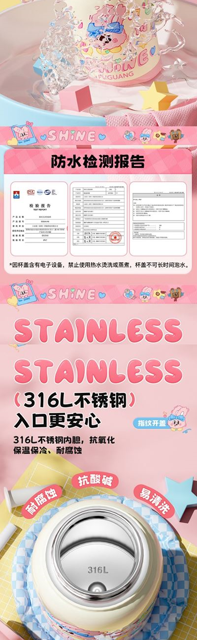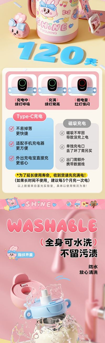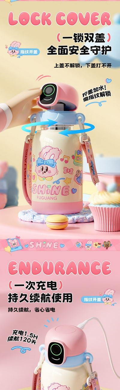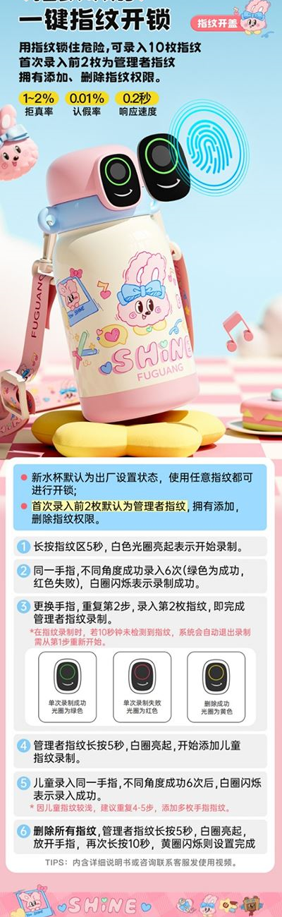 顏色:藍(lán)色 粉色 材質(zhì):316不銹鋼內(nèi)膽,光滑杯壁健康飲水。 杯蓋IPX7級(jí)防水級(jí)防水可放心水洗,密封攜帶享安全。 Type-C充電,適配手機(jī)充電器,外出攜帶跟更方便。 充電3小時(shí),續(xù)航180天。會(huì)學(xué)習(xí)的指紋鎖,越用越靈敏。 包裝:單瓦盒