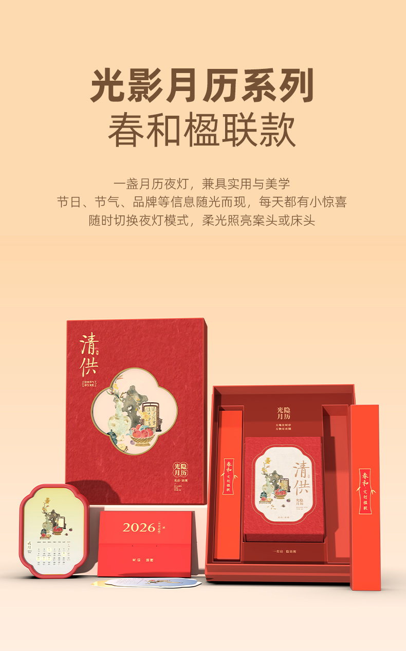 配置 · ① 小雅喜上眉梢咖啡杯 ×1個(gè) ① 清供月歷燈(內(nèi)置鋰電池)×1個(gè) ② 清供光隱月份牌×13張 ③ 春和福字楹聯(lián)×1卷 (大福字*1丨橫批*1丨左·右大楹聯(lián)*1) ④ 春和春條窗花×1卷 (小福字*1丨左·右春條*1丨窗花·花*1丨窗花·竹*1) ⑤ 精致包裝×1套