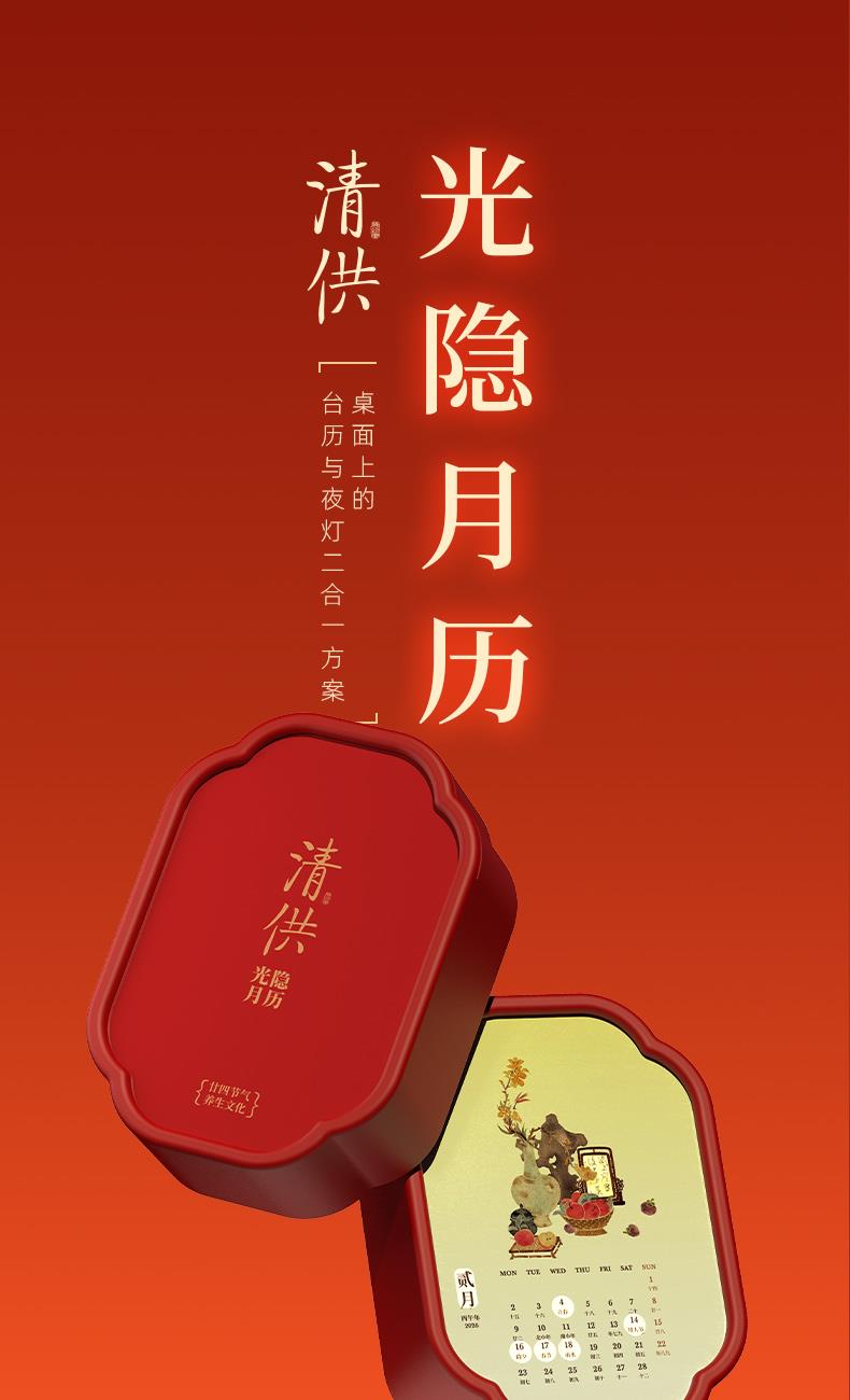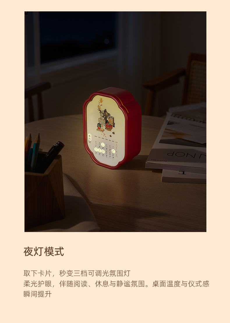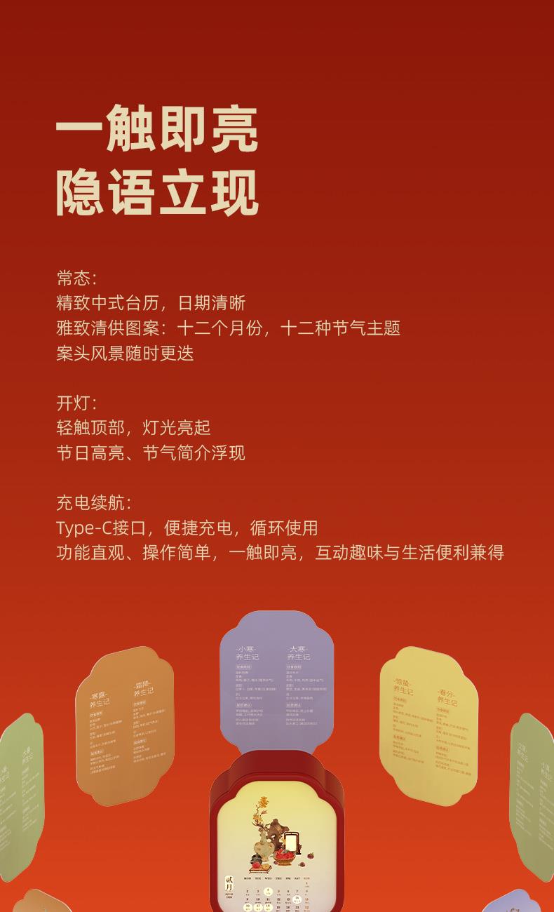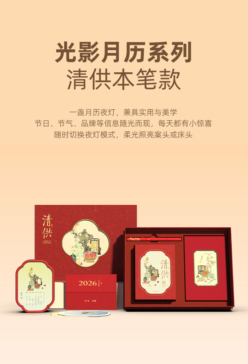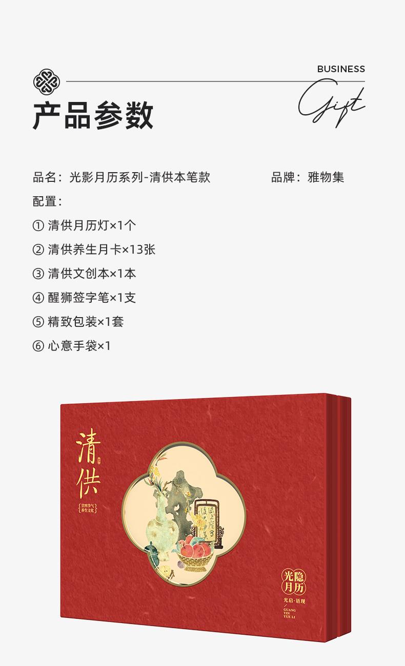 配置 · ① 清供月歷燈(內(nèi)置鋰電池)×1個(gè) ② 清供養(yǎng)生月卡×12張 ③ 清供文創(chuàng)本×1本 ④ 醒獅簽字筆×1支 ⑤ 精致包裝×1套