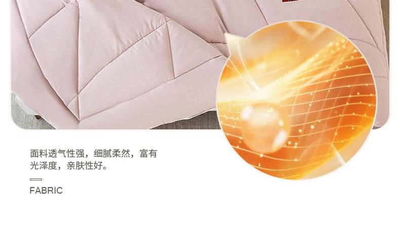 規(guī) 格:200×230cm 面 料:斜紋防羽布(聚酯纖維) 填 充:51%羊毛+10%聚乙烯醇纖維(含有蛋白)+39%聚酯纖維