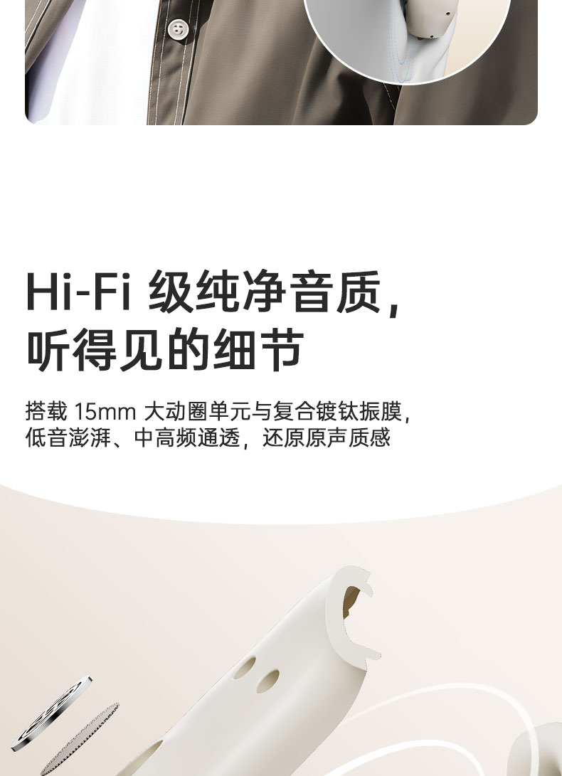 開蓋即連,藍牙5.4穩(wěn)定連接,低延遲,簡化操作,隨心暢聽?!?”妥協(xié)15*11mm鍍鈦振膜 ,聲音清晰通透的高解析音質,輕也要高音質。