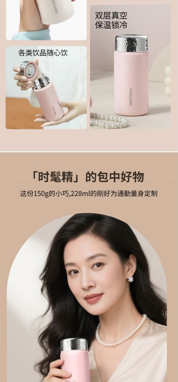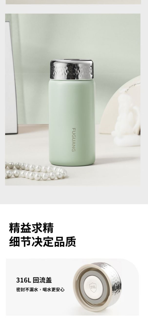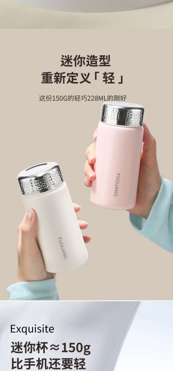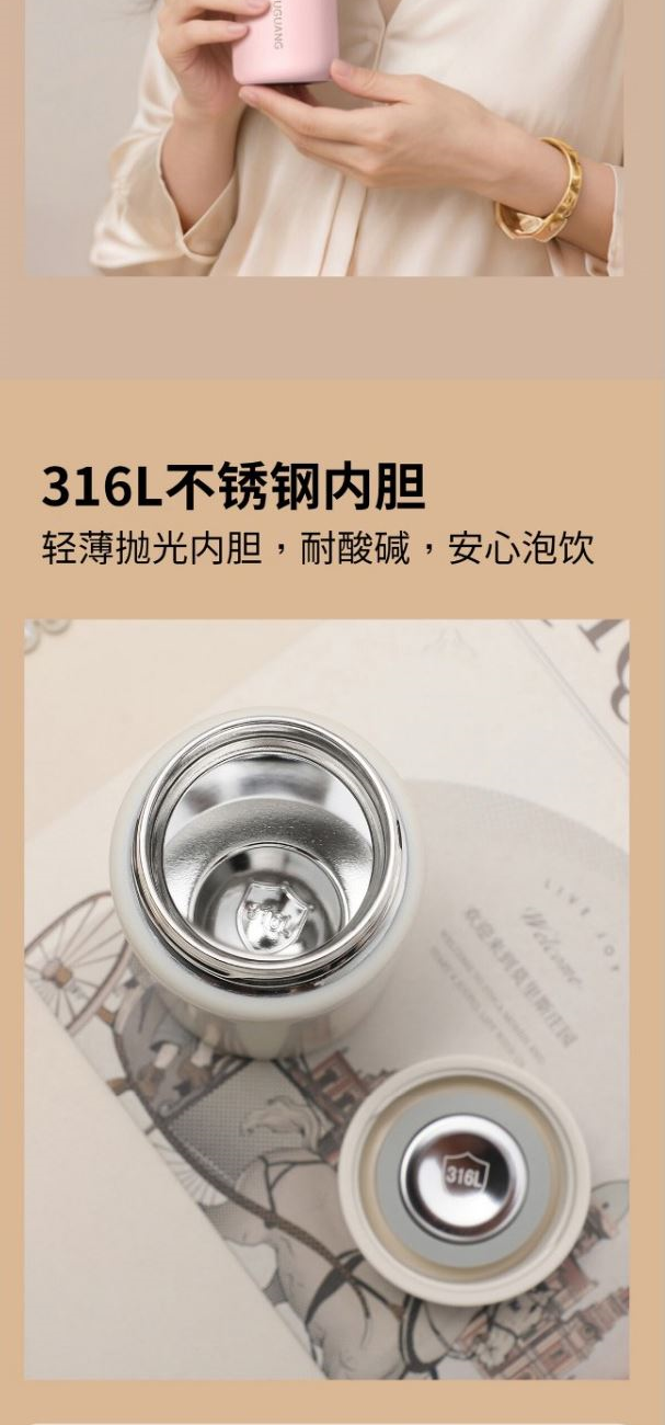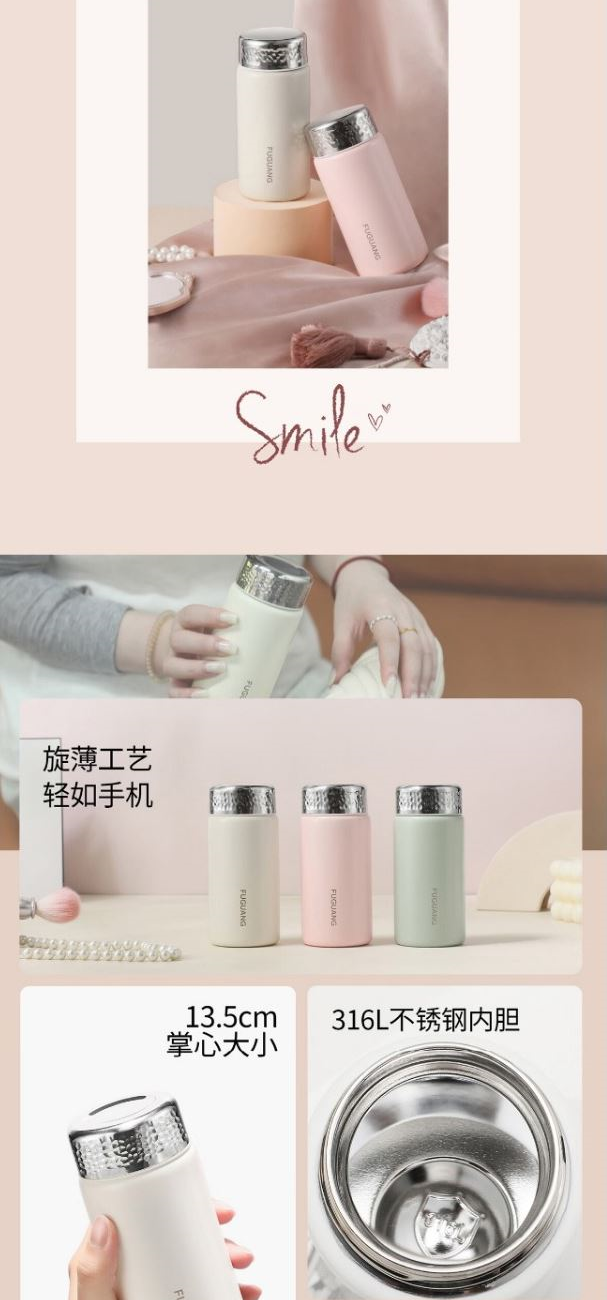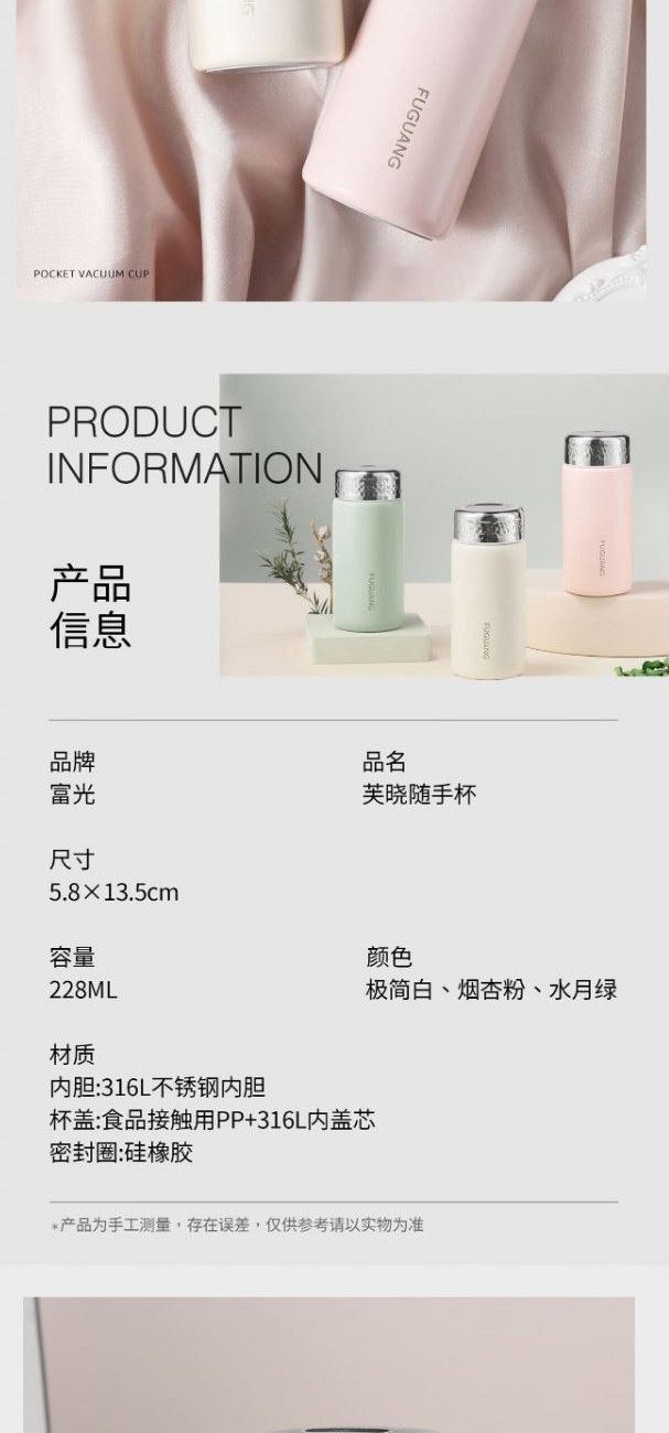 顏色:極簡白 煙杏粉 水月綠 容量:228ml 尺寸:58*135mm 材質(zhì):316L奧氏體不銹鋼內(nèi)膽,316L不銹鋼回流蓋。 無尾真空超長保溫。 超輕杯身設(shè)計(jì),一體成型無縫內(nèi)膽,隨心泡飲,無懼酸堿。 包裝:單瓦盒
