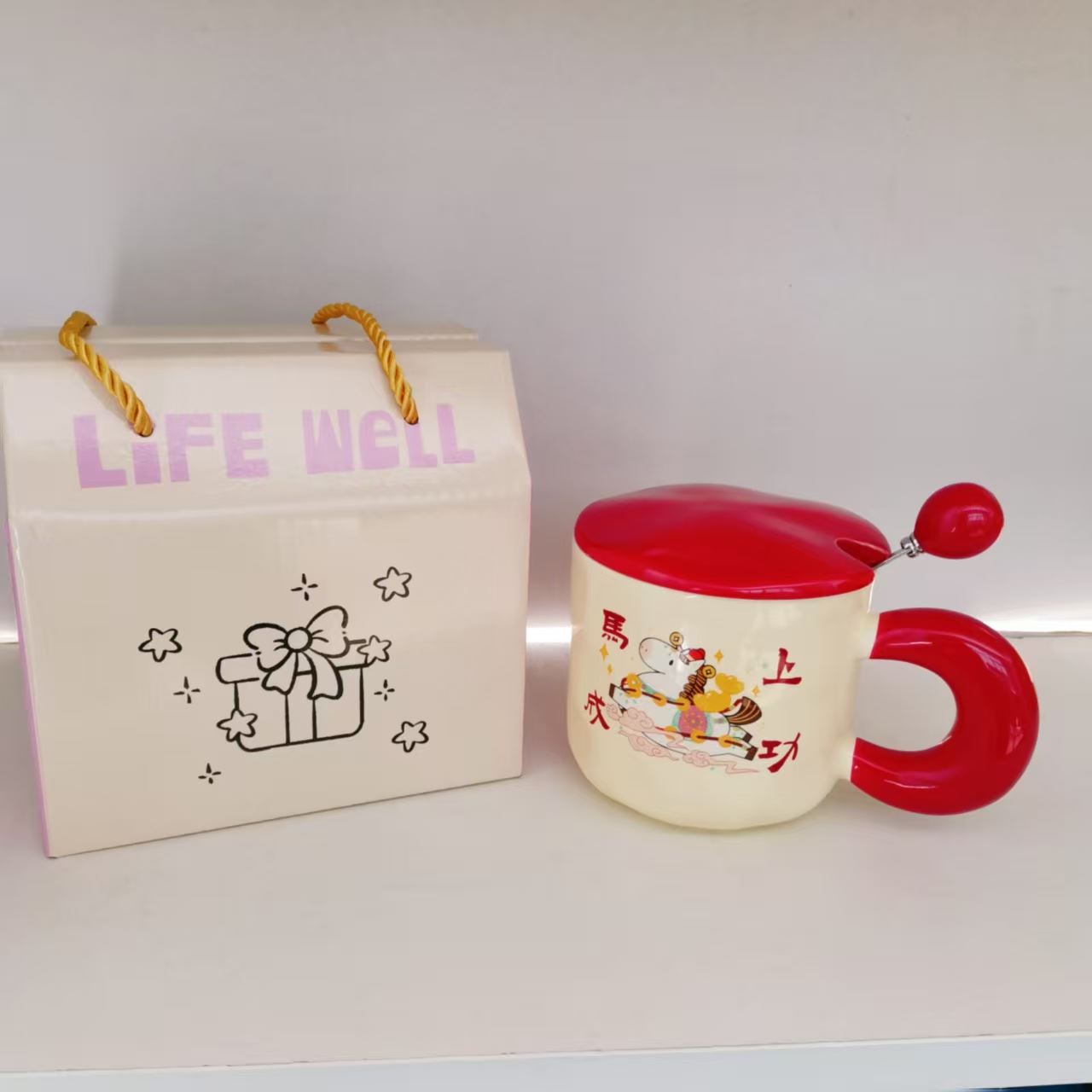 產品組成:整套=1杯1蓋1勺+提繩彩盒 產品材質:陶瓷 花色:混裝 產品規(guī)格:杯=口徑9.5cm,高度9cm; 彩盒尺寸:14.5×10.5×14.5 cm 產品毛重:29kg 外箱尺寸:56×43×58cm 容 量:380毫升 產品特點: INS高顏值馬克杯創(chuàng)意文字寓意好優(yōu)質原料/高溫燒制馬上成功,馬上暴富,馬年大吉;高質量陶瓷杯,精美彩盒包裝。有顏值兼具實用性,是送禮的佳選