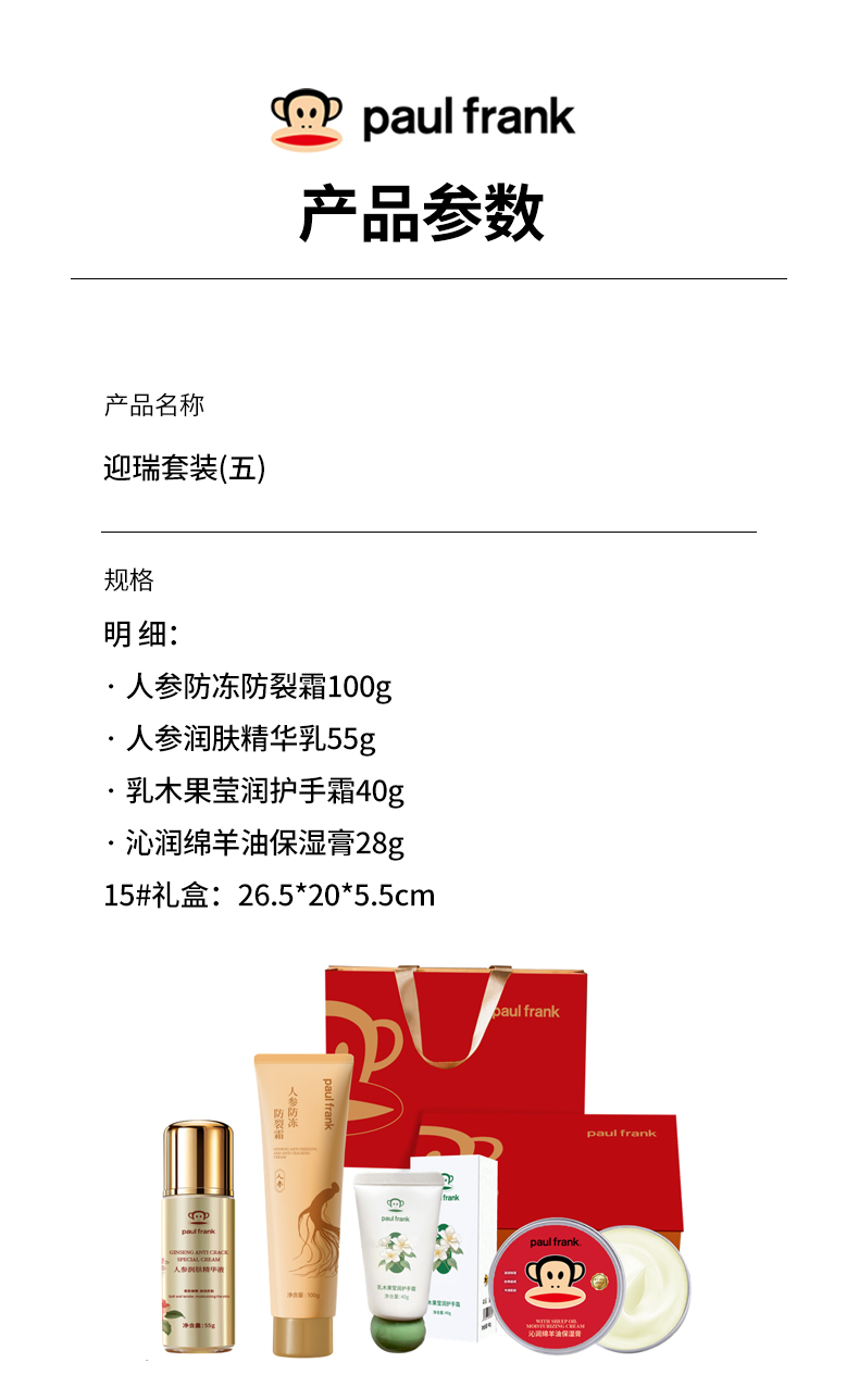 人參防凍防裂霜100g 人參潤膚精華乳55g 乳木果瑩潤護手霜40g 沁潤綿羊油保濕膏28g 15#禮盒:26.5*20*5.5cm