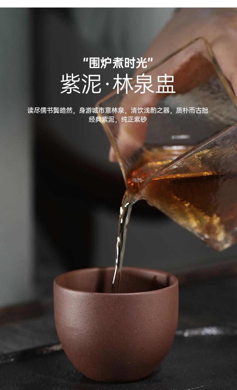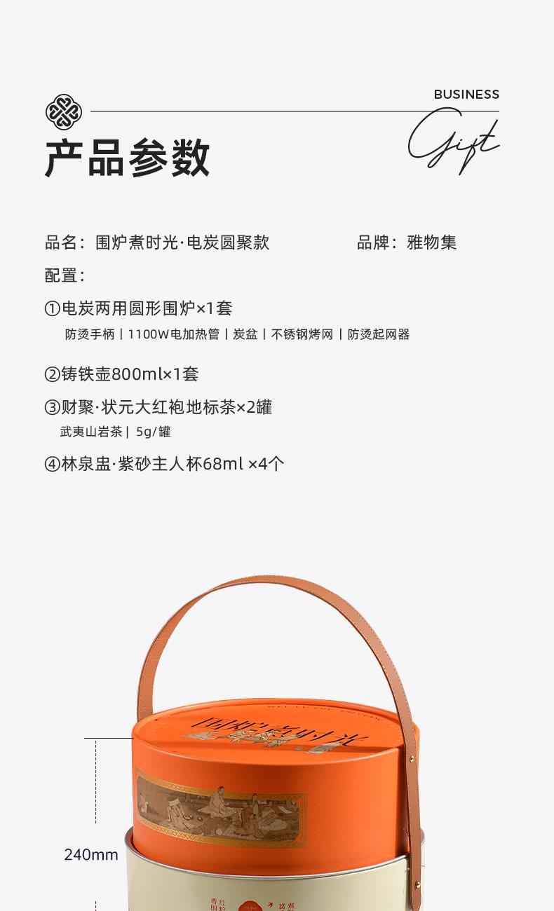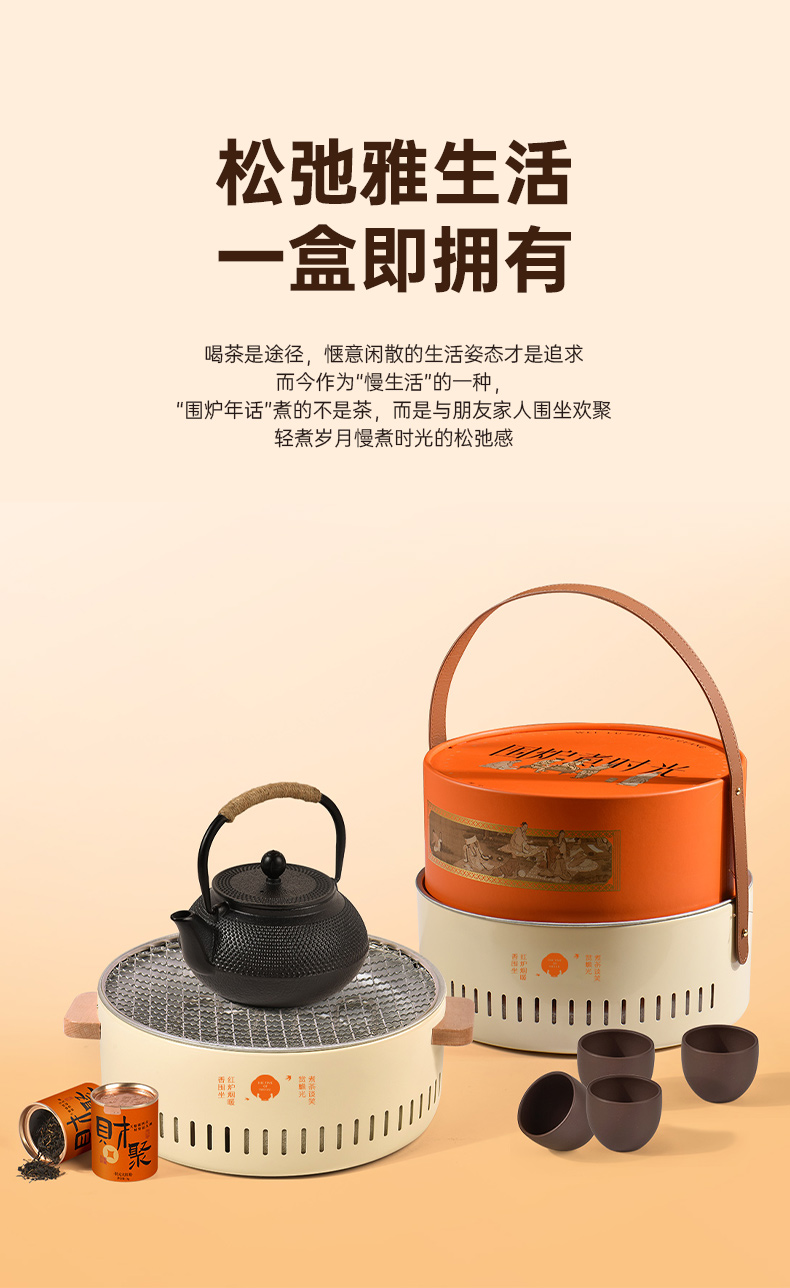 電炭?jī)捎脠A形圍爐×1 鑄鐵壺×1 林泉盅·紫砂主人杯×4 財(cái)聚·狀元大紅袍地標(biāo)茶×2罐