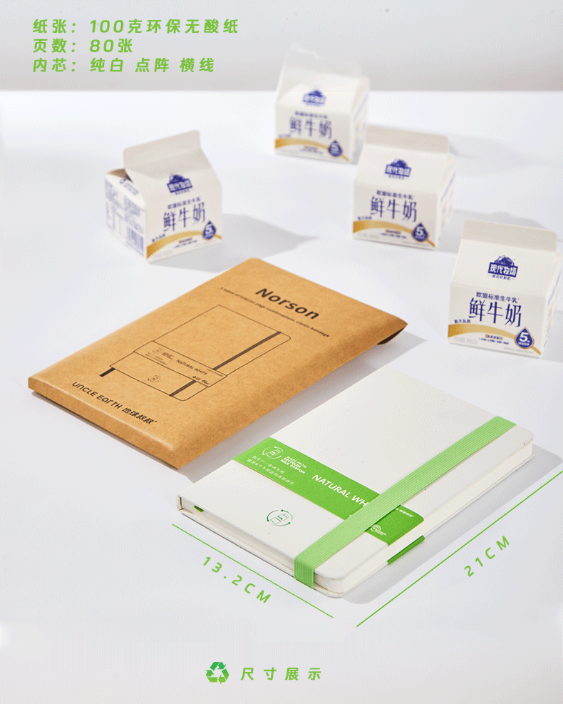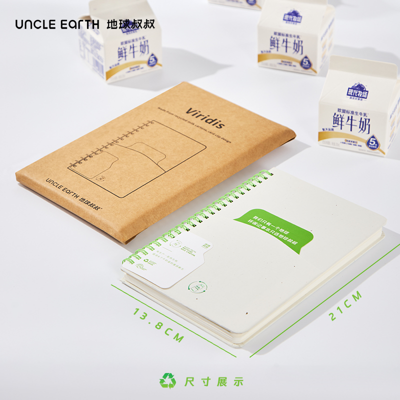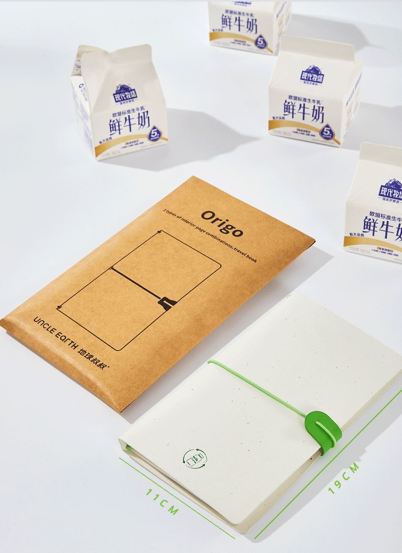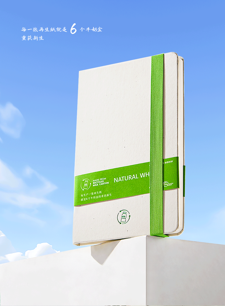 1.每一本環(huán)保筆記本,都始于一個被回收的牛奶盒。讓每個牛奶盒回歸本初循環(huán)再生。每6個牛奶盒就是一張再生紙的重生。