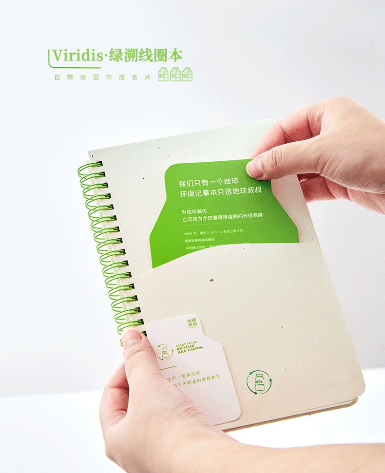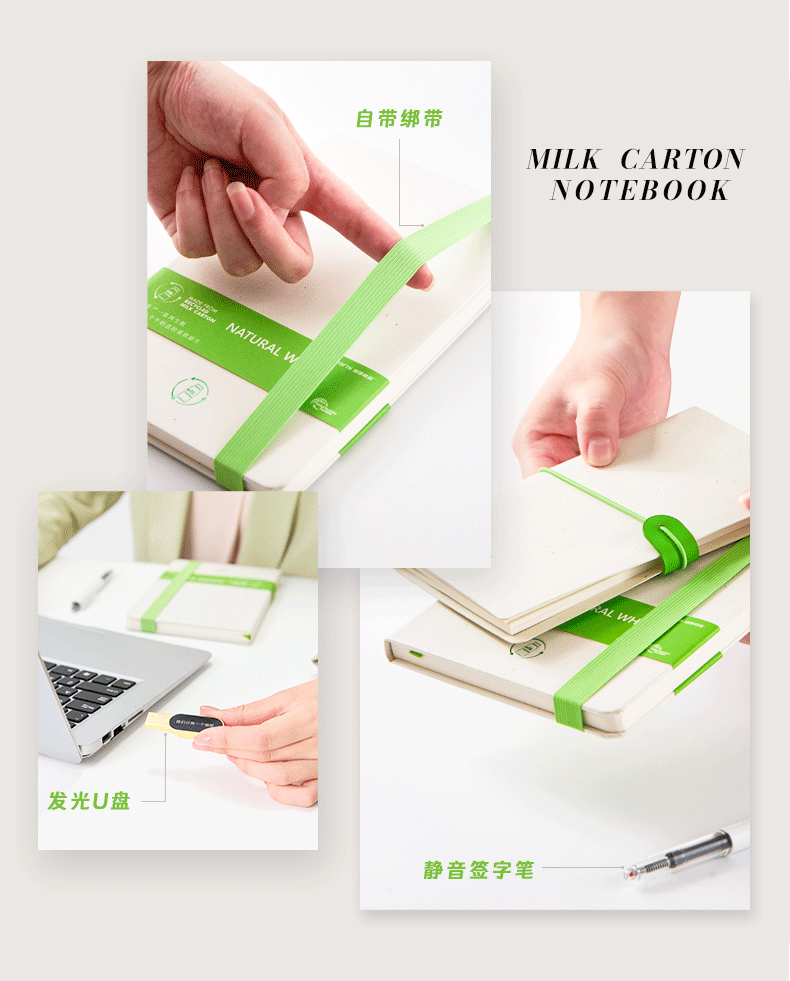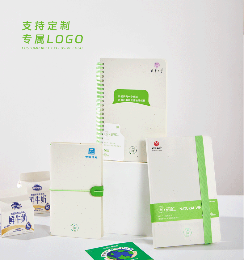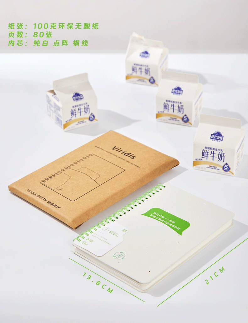 1.每一本環(huán)保筆記本,都始于一個被回收的牛奶盒。讓每個牛奶盒回歸本初循環(huán)再生。每6個牛奶盒就是一張再生紙的重生。