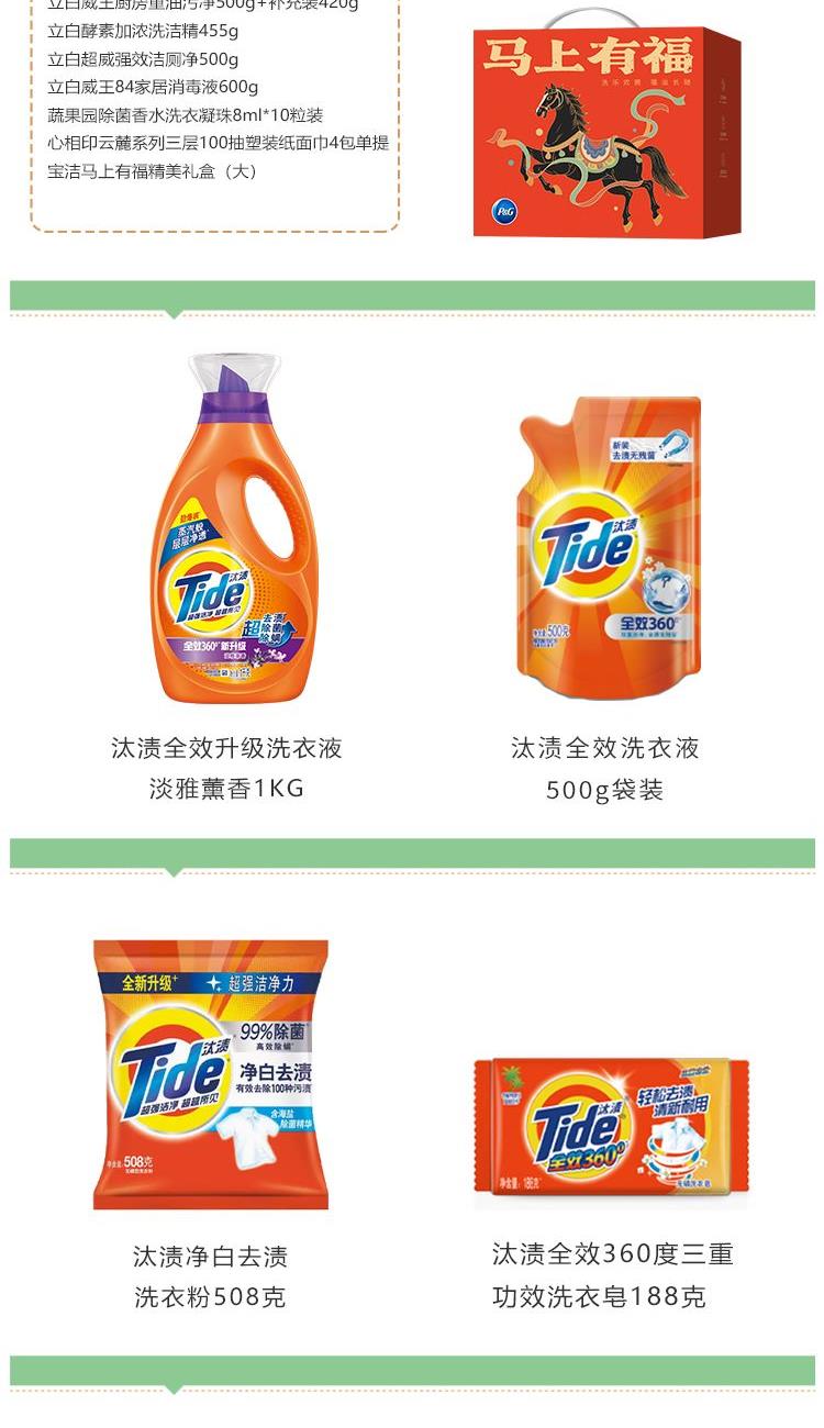 汰漬2合1深層潔凈洗衣液1KG 汰漬全效洗衣液500G袋裝 汰漬凈白去漬洗衣粉508克 汰漬全效360度三重功效洗衣皂188克 立白威王廚房重油污凈500g+補(bǔ)充裝420g 立白酵素加濃洗潔精455g 立白超威強(qiáng)效潔廁凈500g 立白威王84家居消毒液600g 蔬果園香水洗衣凝珠8ml*10粒裝 心相印云麓系列三層100抽塑裝紙面巾4包單提 寶潔馬上有福精美禮盒(大)