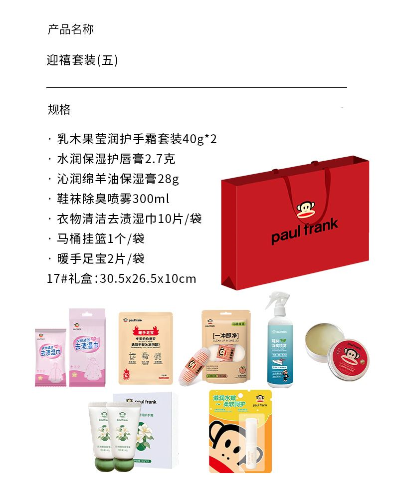 乳木果瑩潤護(hù)手霜套裝40g*2 水潤保濕護(hù)唇膏2.7克 沁潤綿羊油保濕膏28g 鞋襪除臭噴霧300ml 衣物清潔去漬濕巾10片/袋 馬桶掛籃1個/袋 暖手足寶2片/袋 17#禮盒:30.5x26.5x10cm