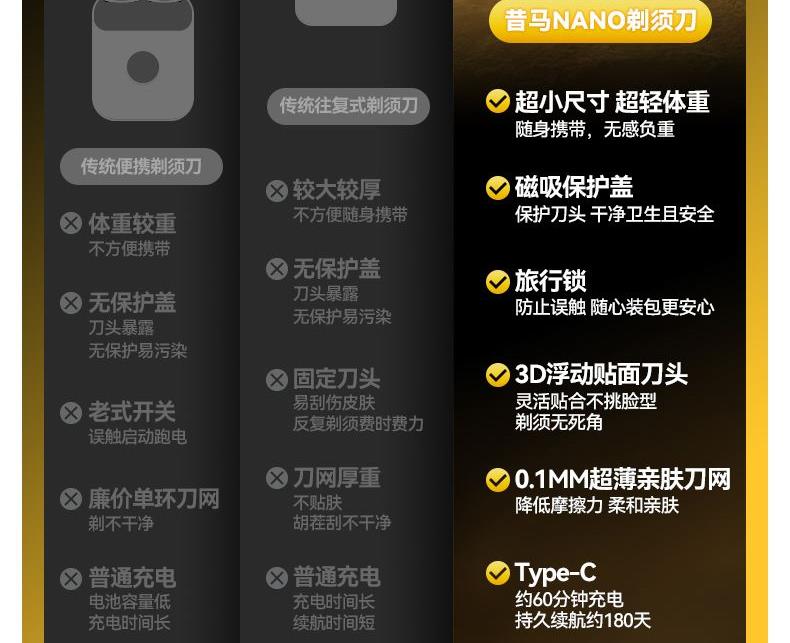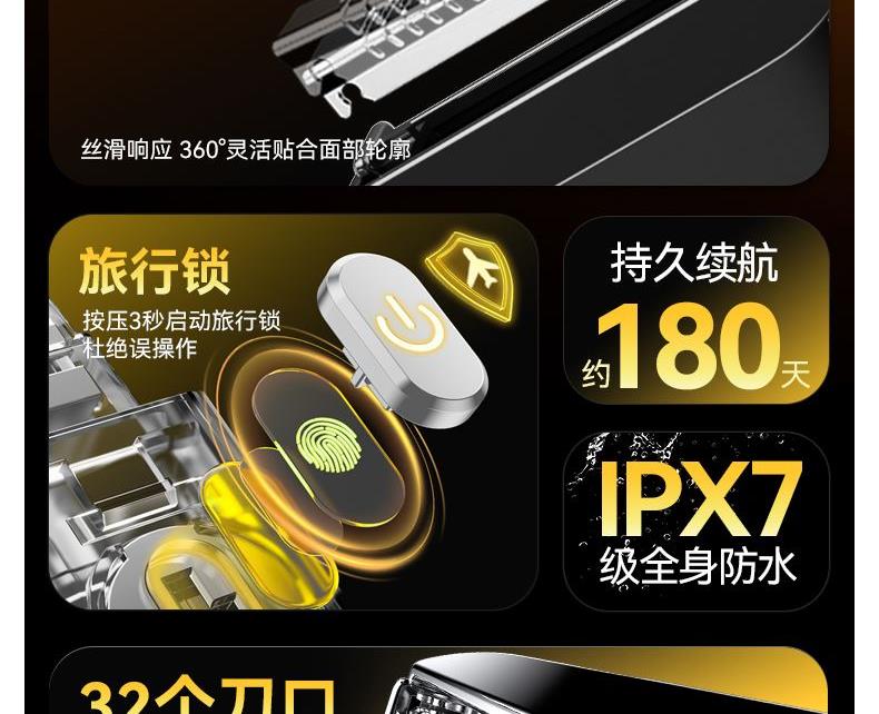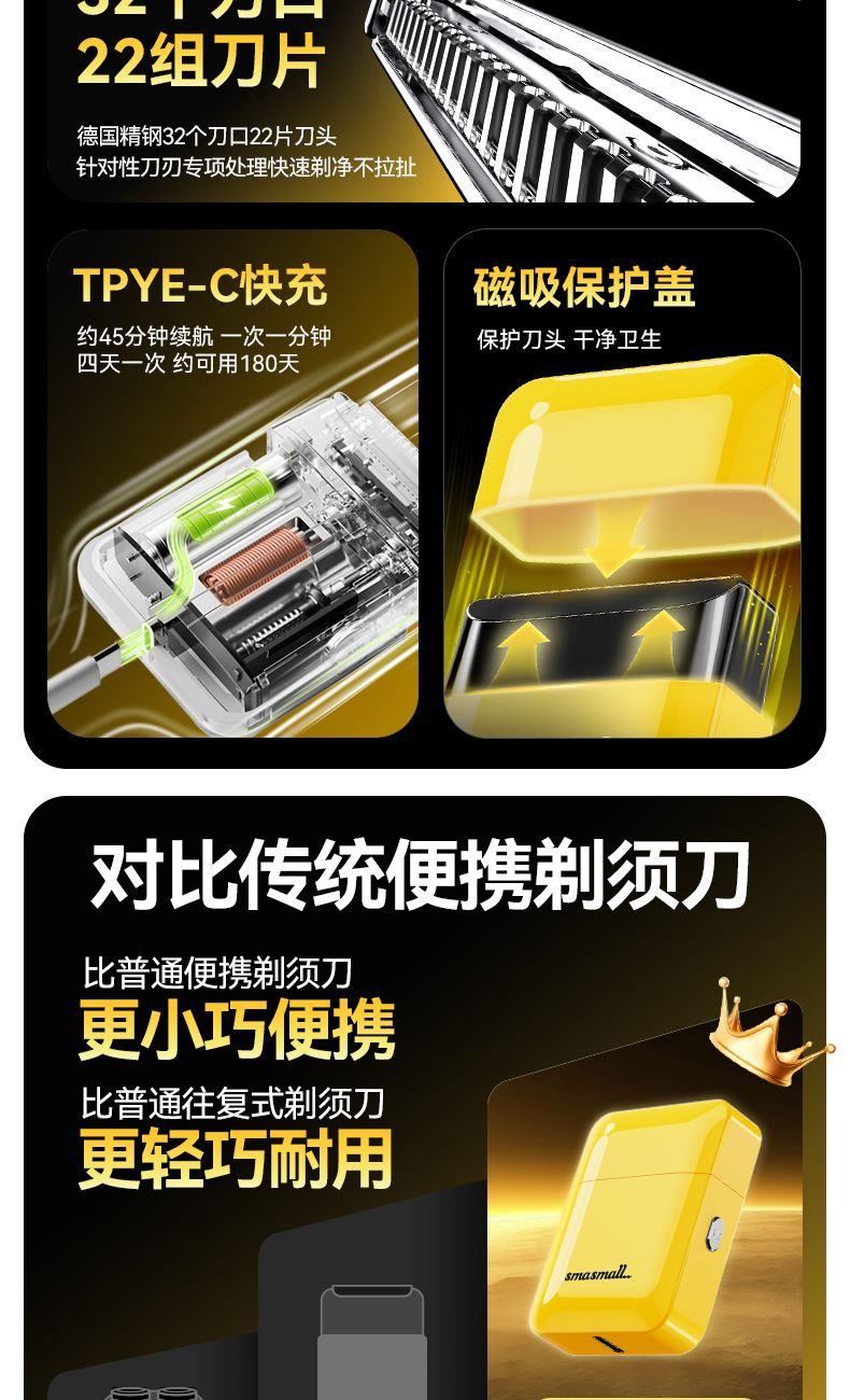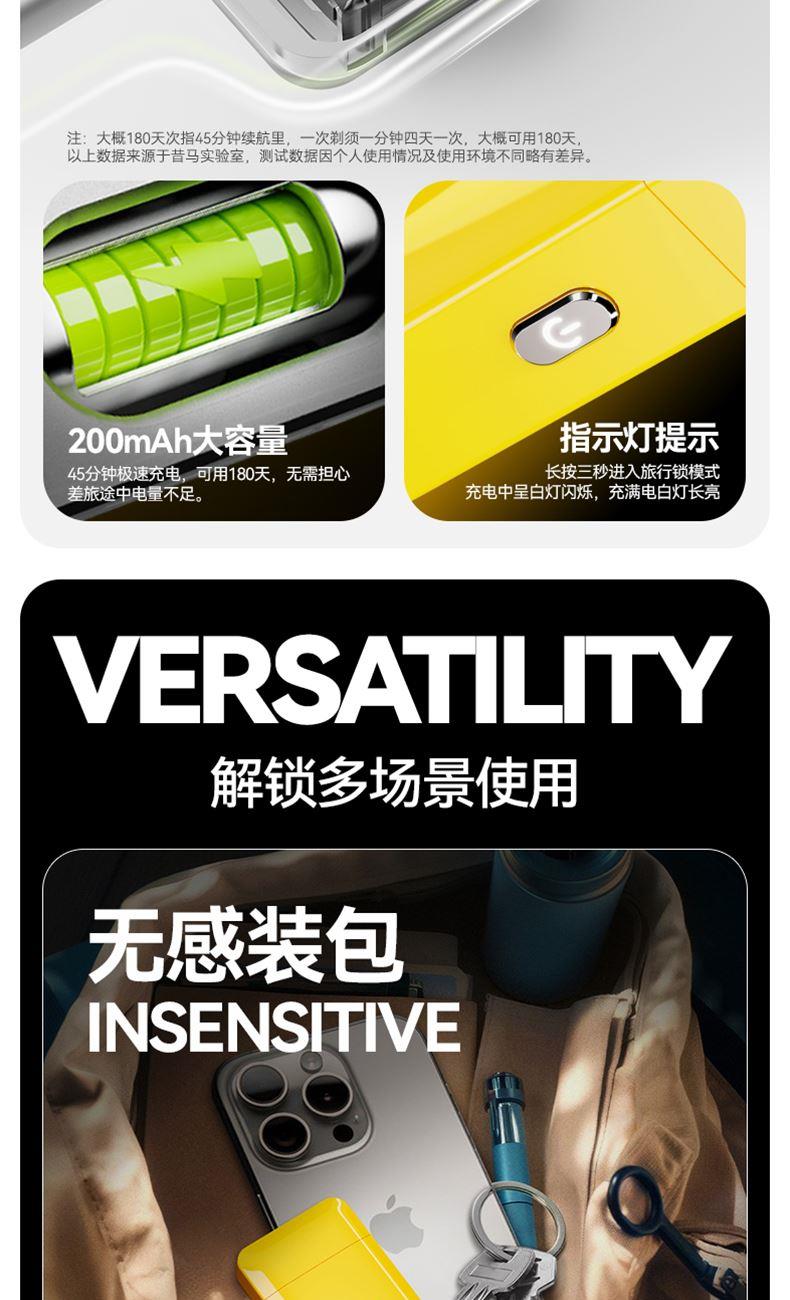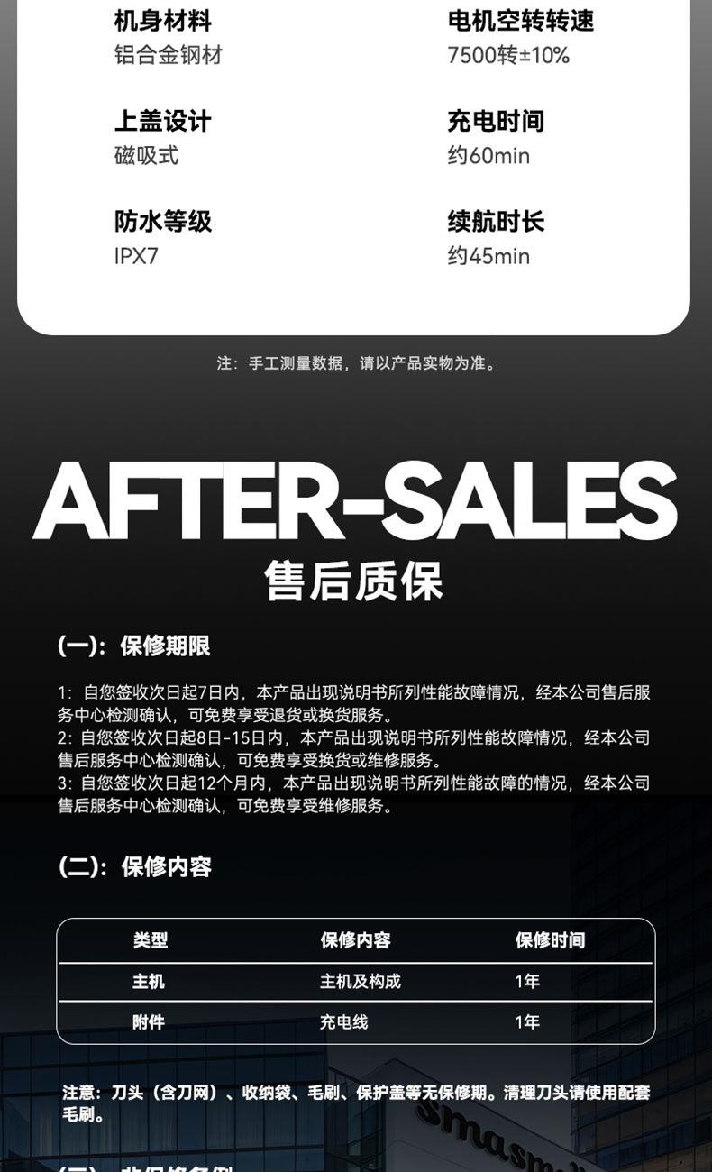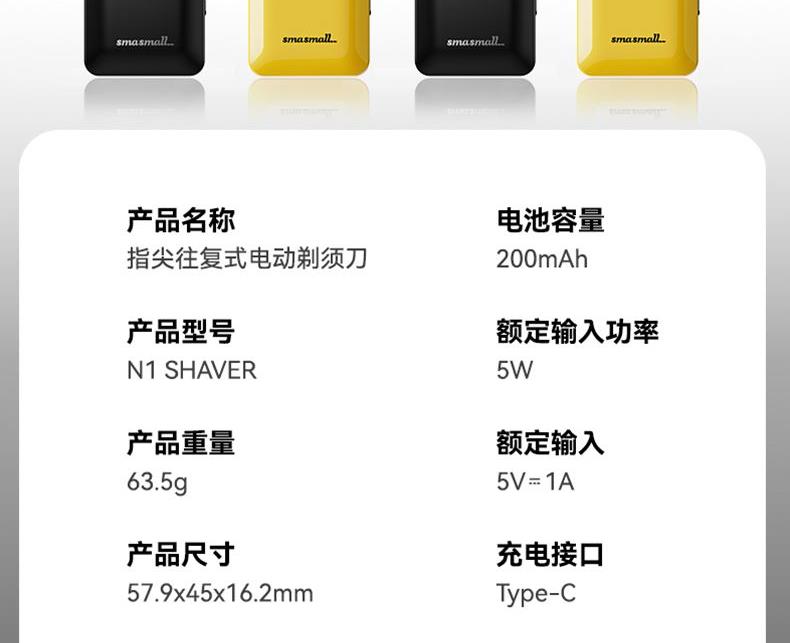 "電池容量: 200 mAh 充電接口: Tpye-C 續(xù)航時間: 大約 45mins 充電時長: 大約 60mins 防水等級: ipx7 刀頭類型:往復式刀頭"