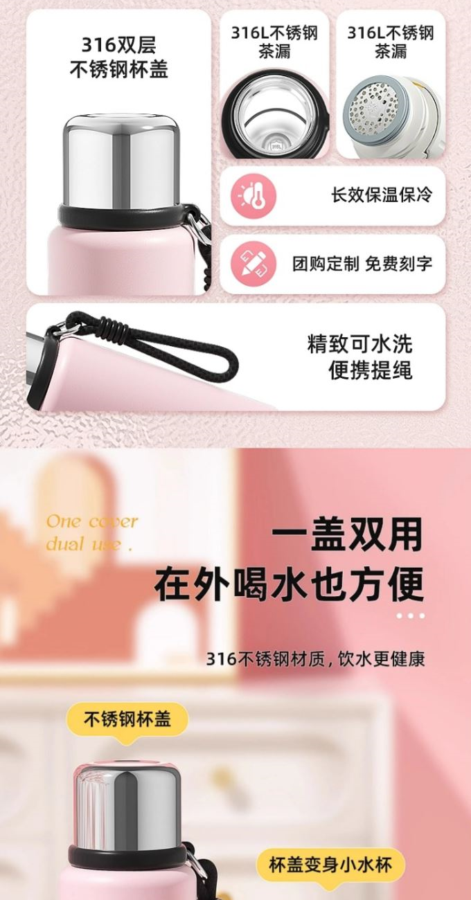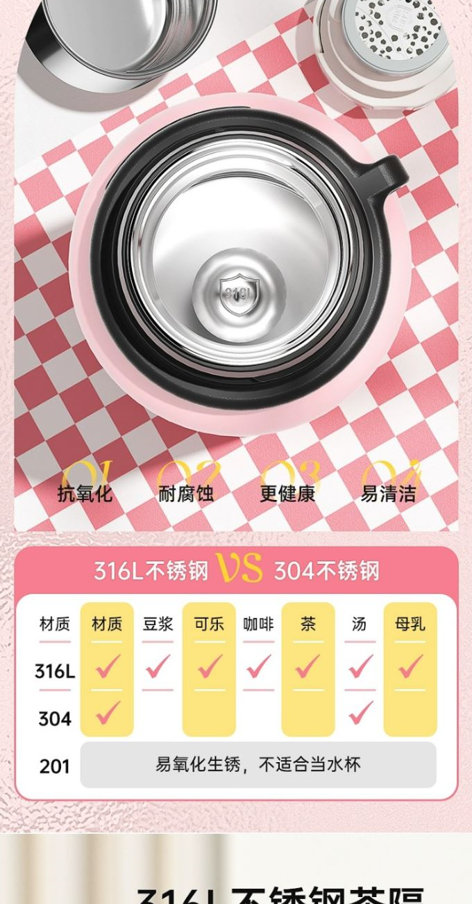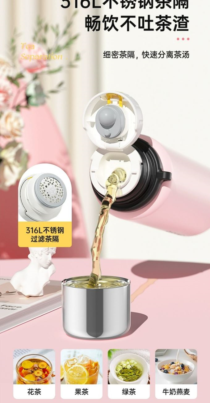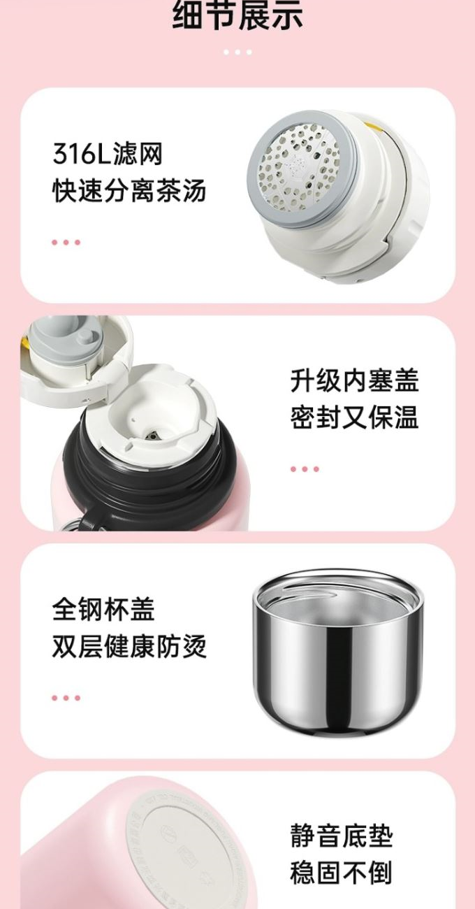 尺寸:82*220mm 顏色:酷黑綠 甜酷粉 梔子白 材質(zhì):316L奧氏體不銹鋼內(nèi)膽、食品級(jí)PP,PC配件。 316L不銹鋼濾網(wǎng)快速分離茶湯。全鋼杯蓋雙層健康防燙。 靜音底墊穩(wěn)固不到。 精致便攜提繩,出行方便,舒適不勒手。 包裝:?jiǎn)瓮吆?